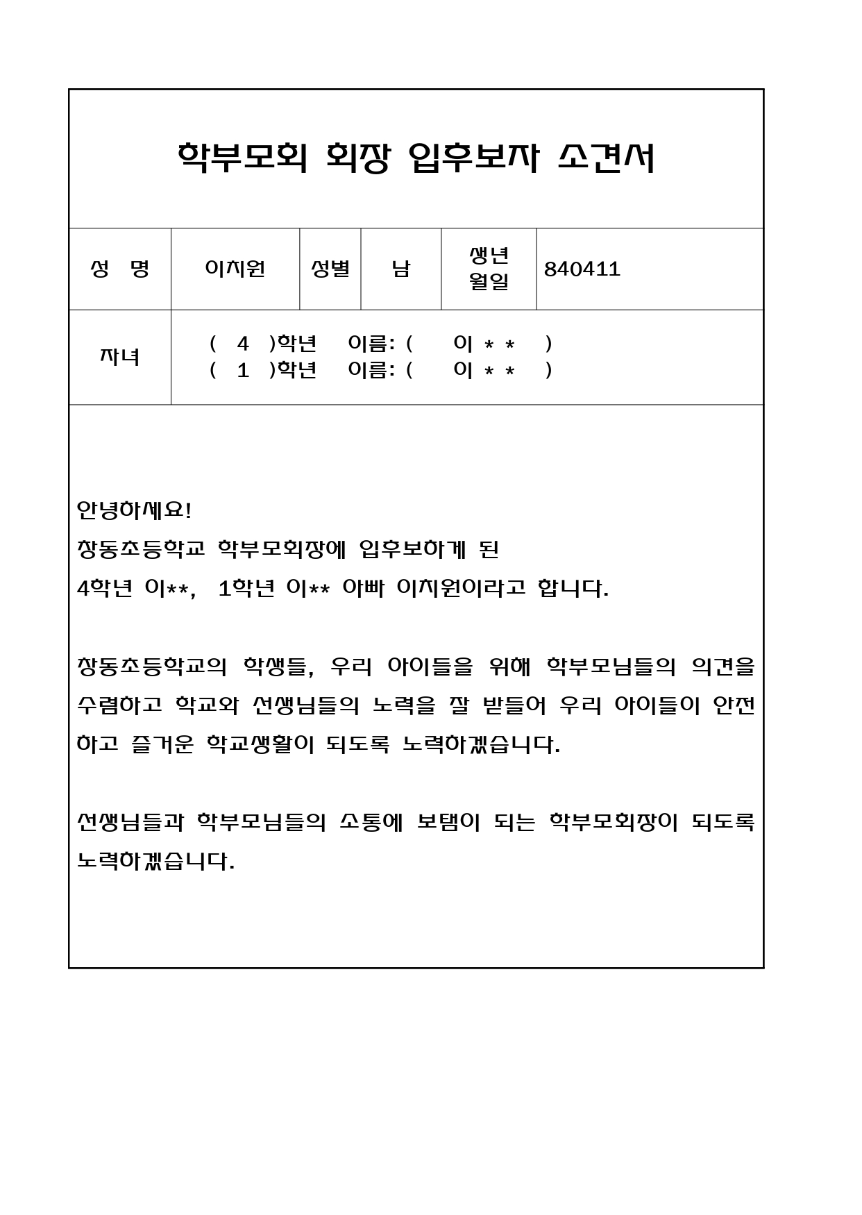 4. 당선자 결정 조건 : 창동 학부모 재적의 10% 이상 참여 필수, 투표 참여자의 과반수 이상 찬성으로 당선 결정