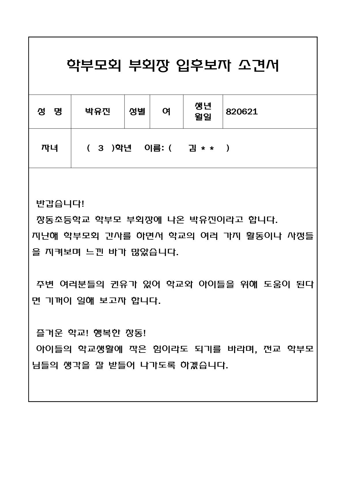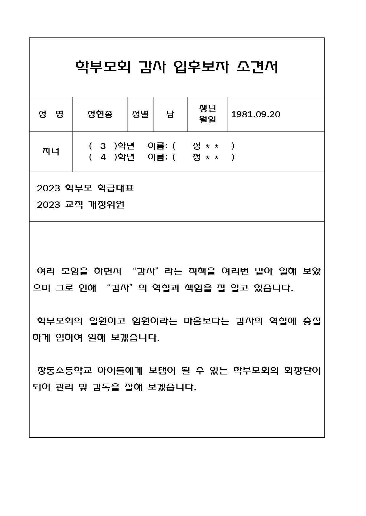 창동초등학교 학부모회 임원에 입후보하신 후보님들의 소견서를 올립니다. 학교의 발전을 위해 입후보 해주신 후보님들께 감사드리며, 내일부터 치루게 되는 학부모회 선거(찬반투표 실시)에 창동 학부모님들의 많은 관심과 참여를 부탁드립니다.